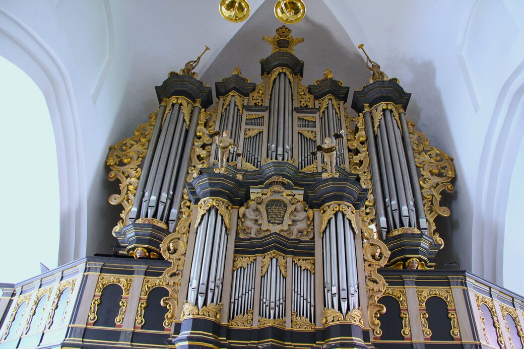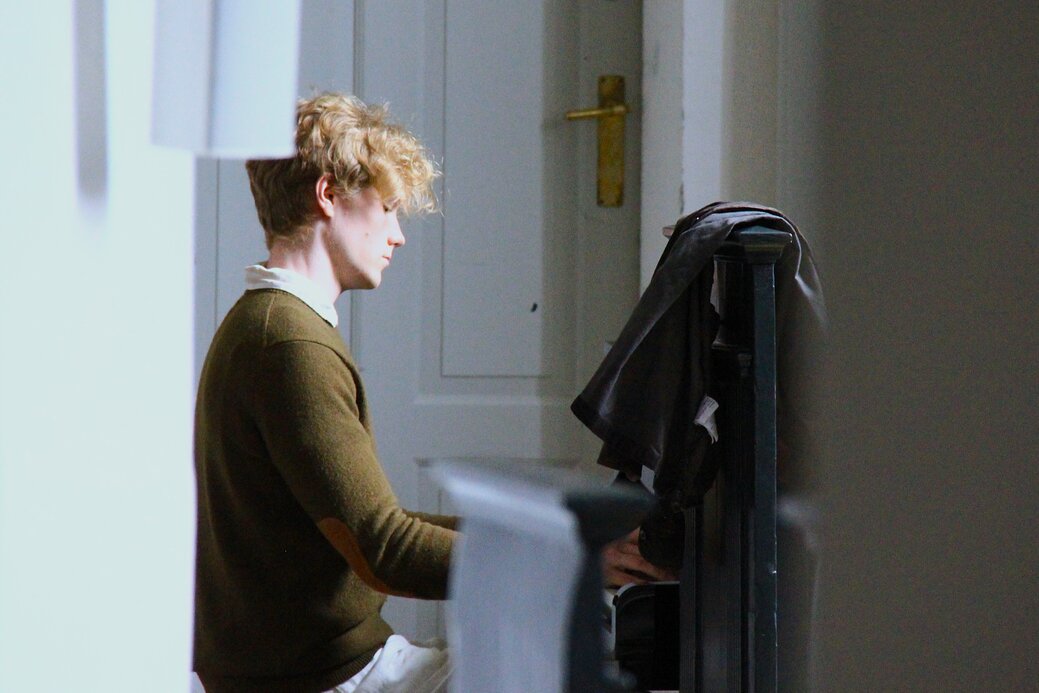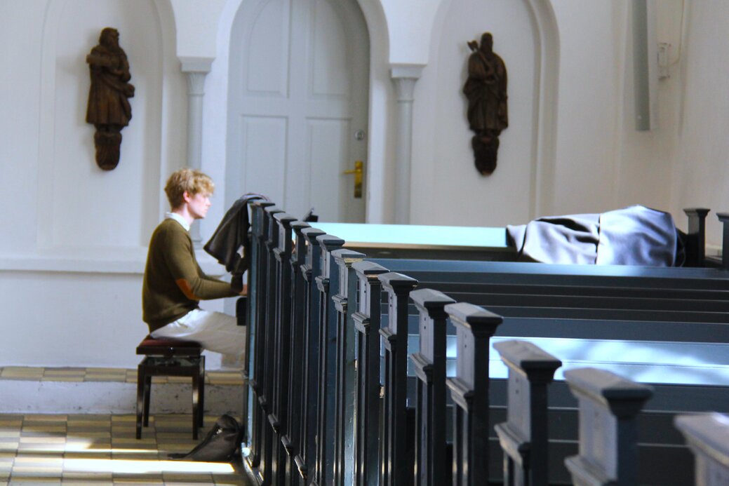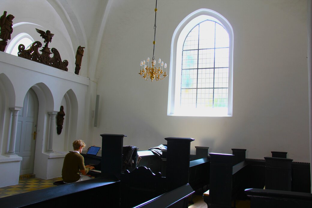 Han sad og spillede på flyglet inden i Sankt Laurenti Kirke.
